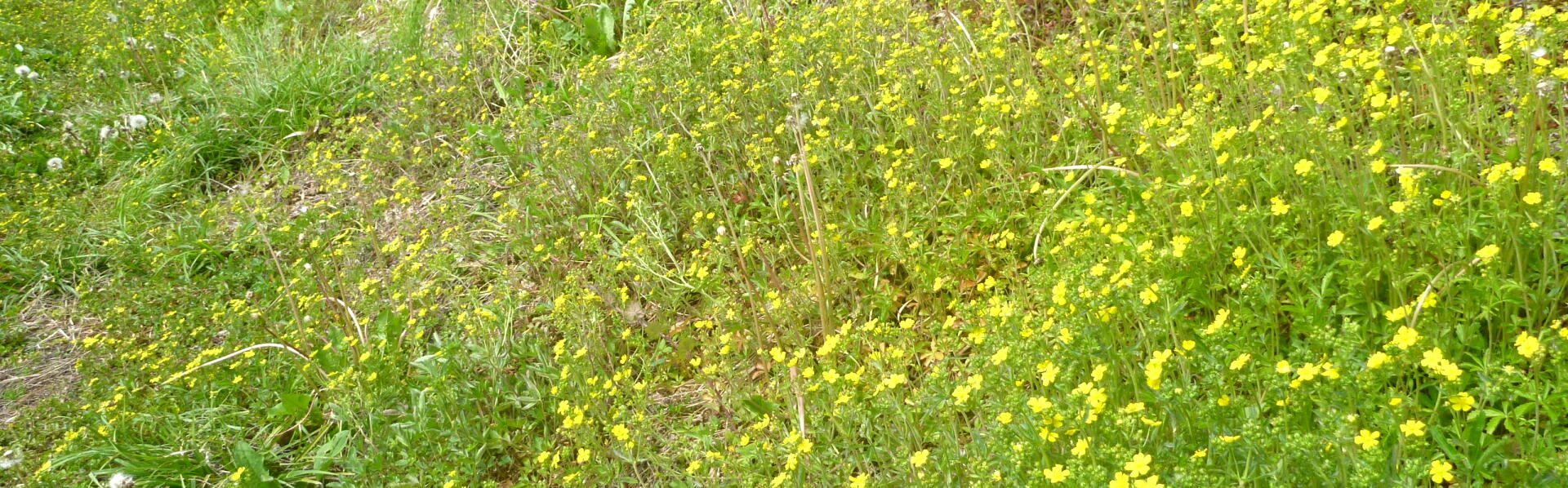 里地の風景づくりは “里の霊山” とおぼしきその参道沿いへの地被植栽からスタートしました。雑草抑制効果を期待してのヒメイワダレソウ植栽でしたが、耕作放棄地に囲まれて雑草の侵入・発生が旺盛で、期待は揺らぎつつありました。そんな時、救世主のごとくに現れたのがオヘビイチゴです。オヘビイチゴはヒメイワダレソウを脅かす雑草でしたが、一転して有望な在郷の雑草抑制材に躍り出ました。