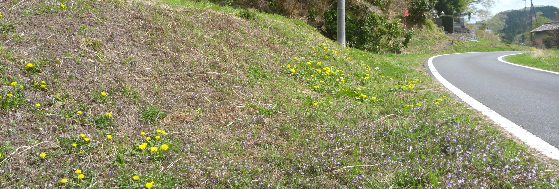 農民たちが築き維持してきた土手は、重機により整形された斜面とは異なり、手づくりの造成作品を感じさせます。里地内道路沿いの土手を “田舎のショーウィンドウ” と見立て、在郷野草による季節の彩りを添えました。